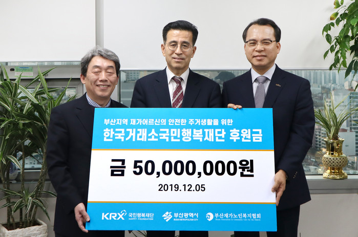 이날 후원금 전달식에는 KRX국민행복재단 조호현 사무국장, 부산광역시 김부재 복지건강국장, 부산재가노인복지협회 이춘성 회장을 비롯한 부산시청, 재가노인협회 사업관계자들이 참석했다.
