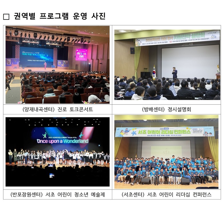 전성수 서초구청장은 “올해 더욱 확대된 권역별 교육지원센터 프로그램으로 학생은 물론 학부모를 포함한 주민 모두에게 맞춤형 교육 서비스를 제공할 것”이라며, ”앞으로도 서초만의 특화된 권역별 교육 사업을 통해 학생들이 미래 리더로서의 역량을 키우고 올바른 사회 구성원으로 성장하도록 든든하게 뒷받침하겠다”고 말했다.