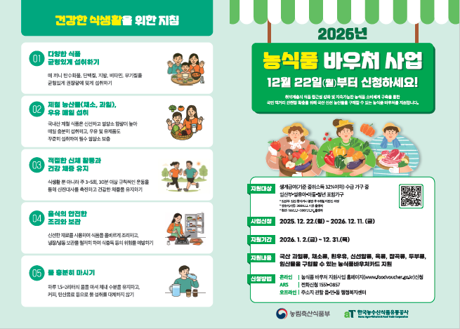 아울러 2026년부터는 바우처 지원과 함께 식생활 교육 프로그램도 신규로 운영한다. 교육은 건강한 식품 선택 방법과 균형 잡힌 식단 구성, 식품 표시 이해 등 일상에서 활용할 수 있는 내용으로 구성했으며, 이를 통해 올바른 식습관 형성에도 도움이 될 것으로 기대된다.