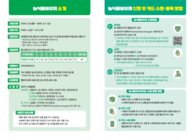 바우처는 전용 카드 형식으로 발급되며 신청은 농식품바우처 누리집(온라인), 자동응답시스템(ARS), 주소지 관할 행정복지센터 방문(오프라인)을 통해 가능하다. 가구별 지원 금액 및 사용처, 기타 자세한 내용은 농식품바우처 홈페이지(foodvoucher.go.kr)에서 확인할 수 있다.