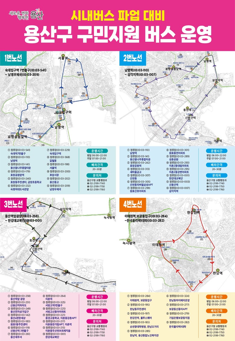 용산구 관계자는 “시내버스 파업으로 교통 혼잡과 이동 불편이 발생하고 있는 만큼, 마을버스와 지하철 이용, 승용차 함께 타기 등 교통 수요 분산에 구민 여러분의 적극적인 협조를 부탁드린다”라고 말했다.
