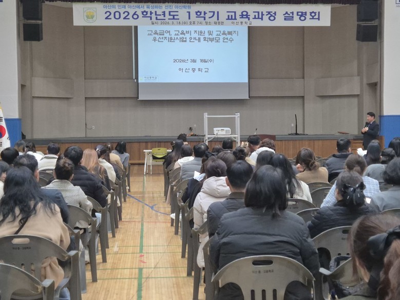 [아산시 세계타임즈=이현진 기자] 아산중학교(교장 강희준)는 지난 18일(수) 오후 7시 본교 태경관에서 ‘2026학년도 학교 교육과정 설명회 및 학부모 총회’를 성황리에 개최했다.