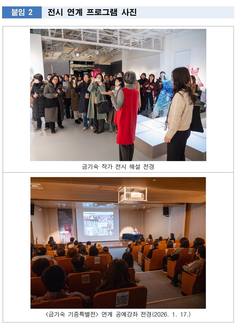 김수정 서울공예박물관장은 “이번 금기숙 기증특별전은 공예 분야에서 다소 생소할 수 있는 패션아트를 주제로 했음에도 폭넓은 대중의 공감을 얻으며 의미 있는 흥행 성과를 거두고 있다”라며, “전시 기간 연장을 통해 더 많은 시민과 국내외 관람객이 이번 전시를 경험할 수 있기를 기대한다”라고 밝혔다.