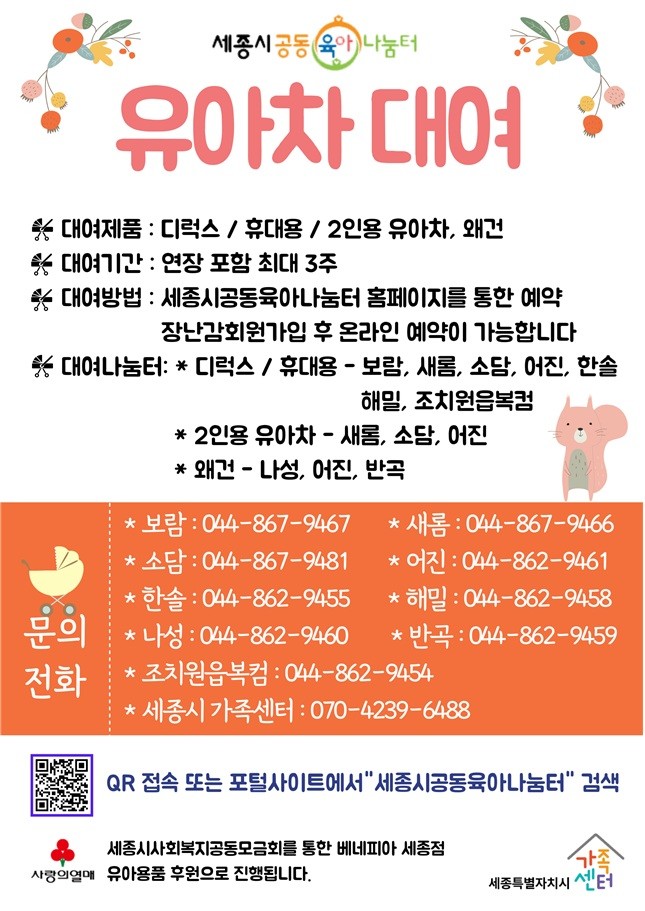 대여 서비스 이용방법 등 자세한 사항은 세종시가족센터(☎070-4239-6488)나 대여나눔터로 문의하면 된다.