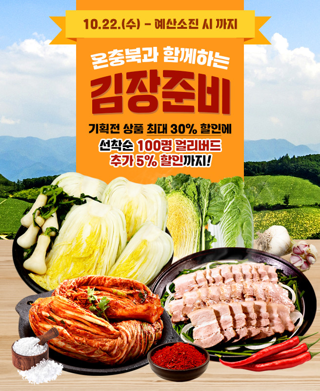 도내 농가의 판로 확대와 도민 소비자들의 생활물가 부담을 완화하기 위해 마련된 이번 행사는 ▲김장기획전 ▲코리아 그랜드 페스티벌 ▲온충북 가치사유 공동구매(4차)로 구성됐다.