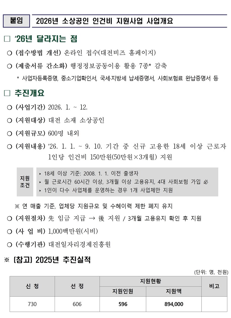 지원대상은 대전시에서 사업장을 운영 중인 소상공인으로, 2026년 1월 1일부터 9월 10일 사이에 18세 이상(2008년 1월 1일 이전 출생) 근로자를 신규 고용한 업체다.