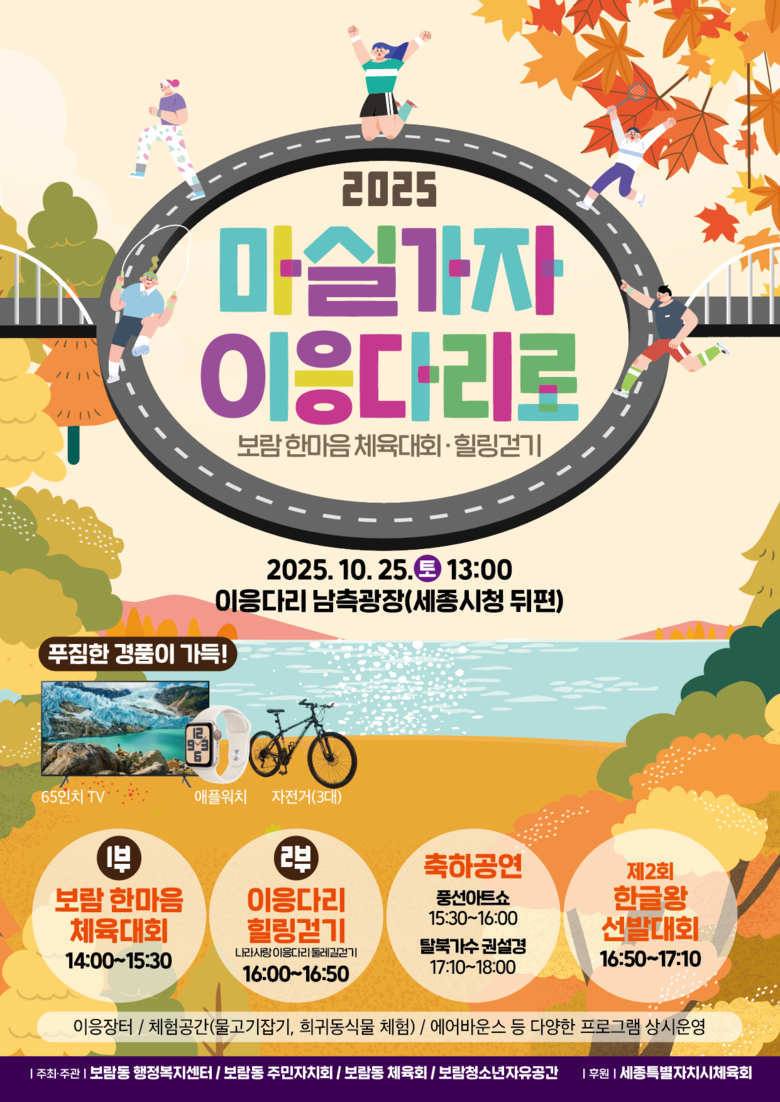 이날 행사는 보람동 주민자치회와 체육회와 함께 관내 대표 축제인 ‘이응다리 힐링걷기’와 ‘보람 한마음 체육대회’를 통합·연계해 문화와 체육을 아우르는 다채로운 프로그램을 운영한다.