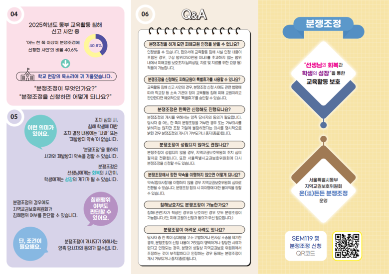 이에 동부교육지원청은 분쟁조정의 의미와 절차를 보다 명확히 안내하고, 교육활동 침해 사안을 관계 회복의 관점에서 해결할 수 있도록 「온(溫)든든 분쟁조정」을 체계화하였다. 지난 1년간 동부지역교권보호위원회를 통해 3건의 조정이 성립되었으며, 이는 교육활동 침해 사안을 회복적 관점에서 해결한 사례로 의미를 갖는다.