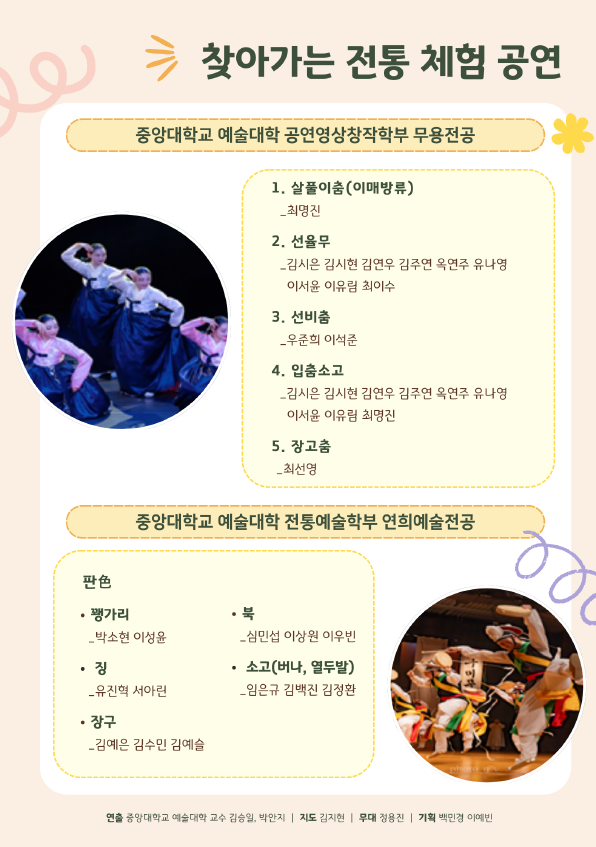 공연은 살풀이춤, 선율무, 선비춤, 입춤소고, 장고춤 등 다양한 전통무용과 연희로 구성되며, 단순 관람에 그치지 않고 소고놀이, 장구, 대북 치기, 버나 체험 등 아이들이 직접 참여할 수 있는 프로그램도 함께 운영된다.