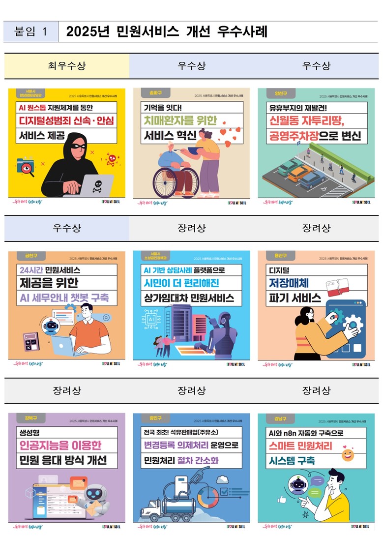 우수상에는 ▴‘민원동행 치매지원 4단계 시스템’ 치매환자를 위한 서비스 혁신(송파구) ▴유휴부지의 재발견! 신월동 자투리땅, 공영주차장으로 변신(양천구) ▴24시간 민원서비스 제공을 위한 AI 세무안내 챗봇 구축(금천구)한 개선사례가 선정되었다.