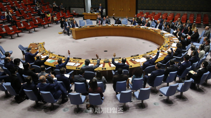 유엔 안전보장 이사회에서 거수 표결을 하고 있는 각국 유엔대사들. 27일(현지시간) 미 연방법원 맨해튼 지법에서는 유엔 대사중 2명에 대한 거액의 뇌물 제공 혐의로 중국 부호에 대한 유죄판결이 내려졌다. 2017.07.27