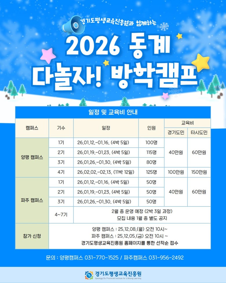 - AI, 코딩, 영어, 자연·문화 프로그램 구성 [경기도 세계타임즈=송민수 기자] 다가오는 겨울방학을 맞아 경기도평생교육진흥원이 경기미래교육캠퍼스에서 1~2월 한 달간 ‘다놀자! 방학캠프’를 운영한다. 전국 초등학교 3학년부터 중학교 1학년 학생이라면 누구나 참여할 수 있으며, 파주 캠퍼스는 12월 5일, 양평 캠퍼스는 8일부터 모집을 시작한다.