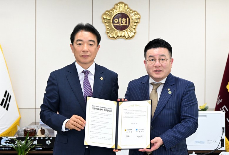 [경남 세계타임즈=최성룡 기자] 경상남도의회(최학범 의장)는 18일, 집무실에서 경남도 김맹숙 복지정책과장 등 관계자들이 참석한 가운데 부산제2항운병원(황성환 병원장)과 취약계층 대상으로 무료 종합건강검진 실시 등을 위한 업무협약을 체결하였다.