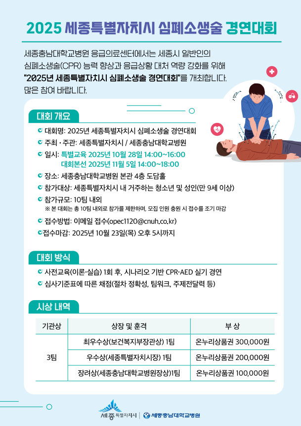 - 23일까지 세종시 심폐소생술 경연대회 참가자 모집…안전문화 확산 - [세종 세계타임즈=이채봉 기자] 세종특별자치시(시장 최민호)가 내달 5일 세종충남대학교병원 도담홀에서 개최하는 2025년 세종시 심폐소생술(CPR) 경연대회 참가자를 모집한다.