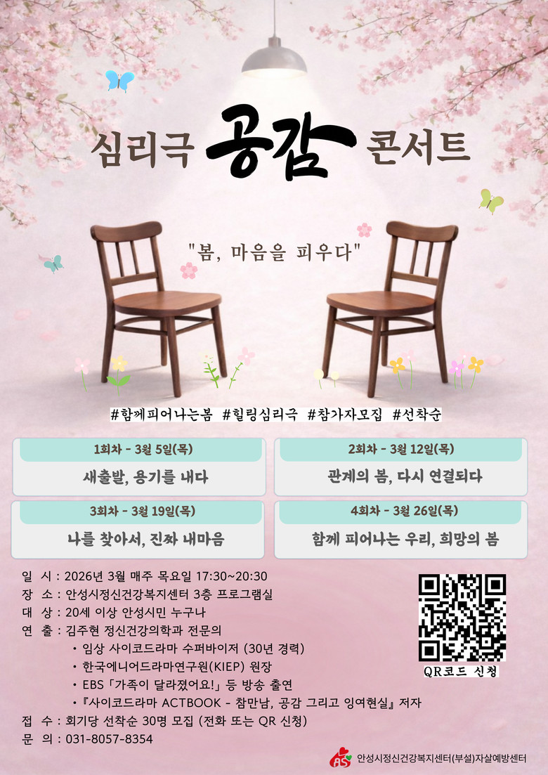 20세 이상 안성시민 누구나 무료로 참여할 수 있으며, 신청은 2월 6일부터 3월 25일까지 QR코드 또는 안성시정신건강복지센터 홈페이지(www.asmhwc.co.kr)를 통해 선착순으로 120명을 모집한다.