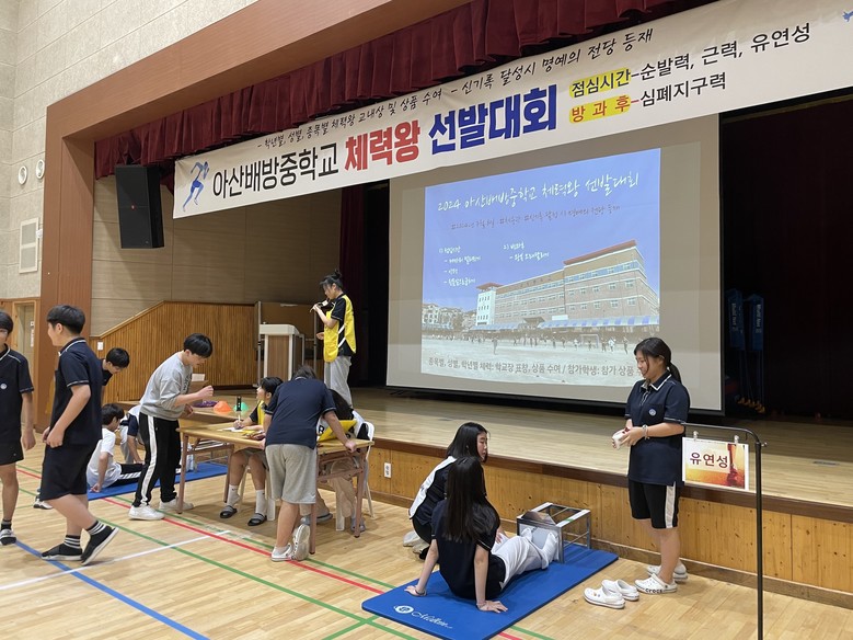 [아산시 세계타임즈=백택기 기자] 아산배방중학교(교장 이병례)는 지난 8일 점심시간과 방과 후에 승리관에서 ‘2024 체력왕 선발대회’를 개최하였다.