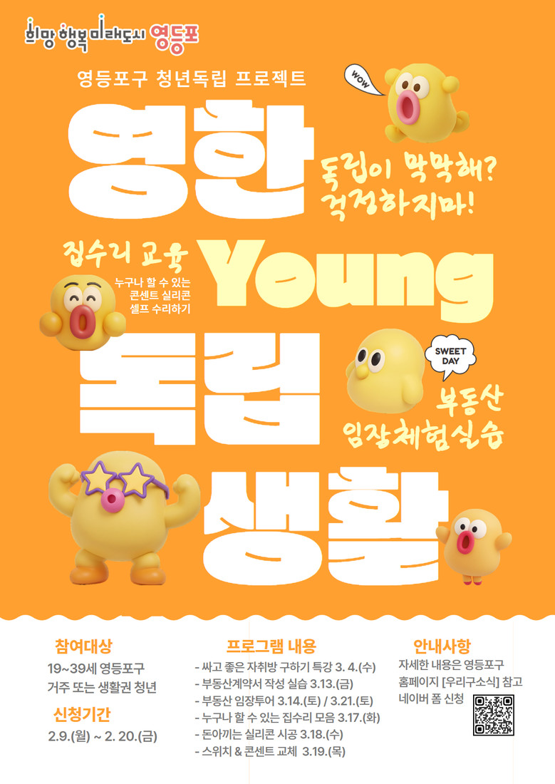 - 2월 9일부터 20일까지 만 19~39세 청년 100여 명 모집 [영등포구 세계타임즈=이장성 기자] 영등포구(구청장 최호권)가 청년 독립 지원 프로그램 ‘영(Young)한 독립생활’ 참여자를 2월 9일부터 20일까지 모집한다고 밝혔다.