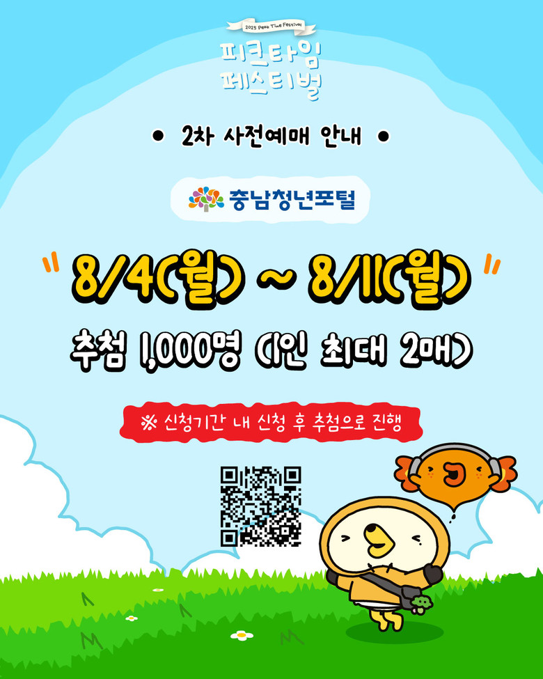 입장권 배부 신청은 충남청년포털(https://youth.chungnam.go.kr)을 통해 1인 당 2매까지 가능하며, 대상자는 신청자 가운데 추첨을 통해 선정한다.