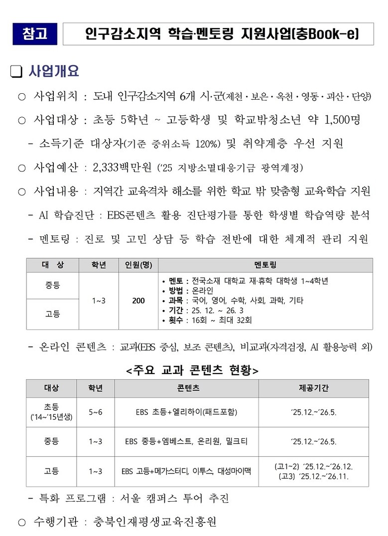 총 23억 원의 지방소멸대응기금이 투입되는 이 사업은 제천, 보은, 옥천, 영동, 괴산, 단양 등 도내 6개 시·군 학생 1,500명을 대상으로 학교 밖 맞춤형 교육을 지원한다. 학생들은 EBS 콘텐츠를 활용한 AI 학습진단으로 자신의 역량을 분석받는 것은 물론, 대학생 멘토와의 1:1 온라인 상담을 통해 체계적인 학습 관리를 받게 된다.