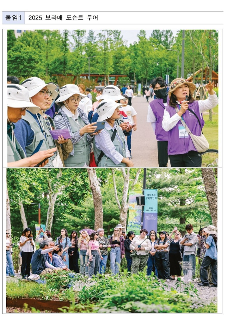 지난해 보라매공원에 111개의 정원을 선보인 서울국제정원박람회는 1,044만 명의 시민이 방문했으며, 도슨트 투어에는 총 4,072명의 시민이 참여했다.