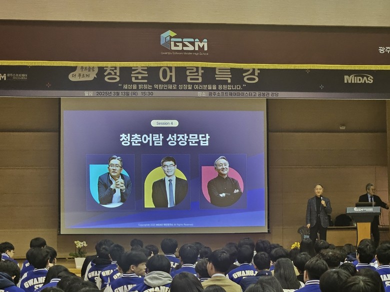 [광주 세계타임즈=손권일 기자] 광주소프트웨어마이스터고등학교(이하 광주소마고)가 지난 13일 본교 강당에서 마이다스 그룹 이형우 회장을 초청해 전교생 및 교직원을 대상으로 특별 강연을 실시했다.
