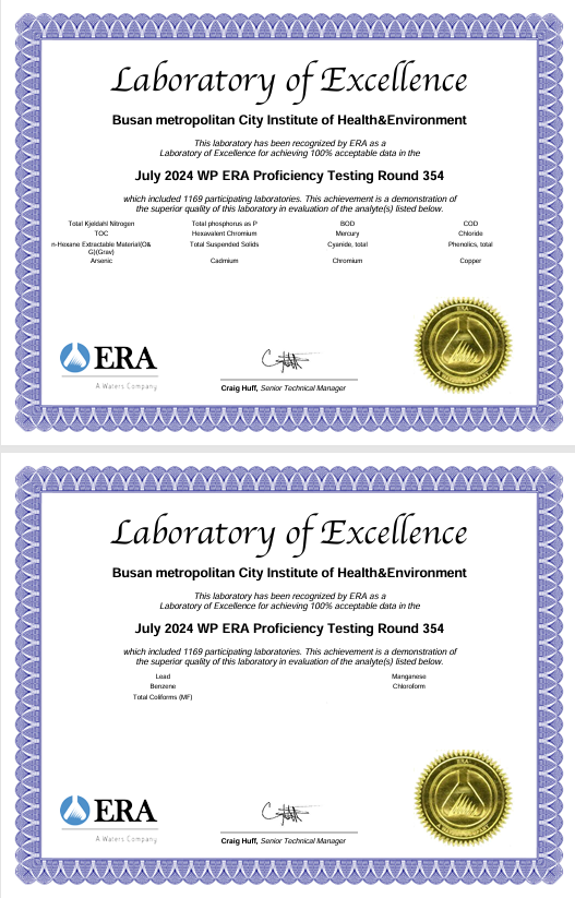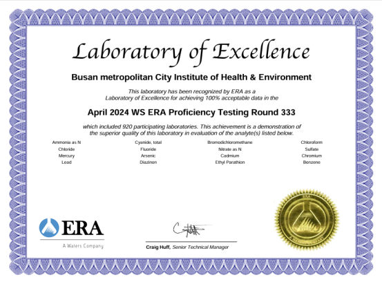 2024년 80여 개국이 참여한 국제숙련도 평가 중 ▲먹는 물 분야 17개 항목 ▲수질 분야 21개 항목 ▲토양 분야 12개 항목 ▲환경 유해인자(모래) 분야 3개 항목 등 평가받은 전 항목에서 최고 등급인 ‘만족(Satisfactory)’을 받았다.
