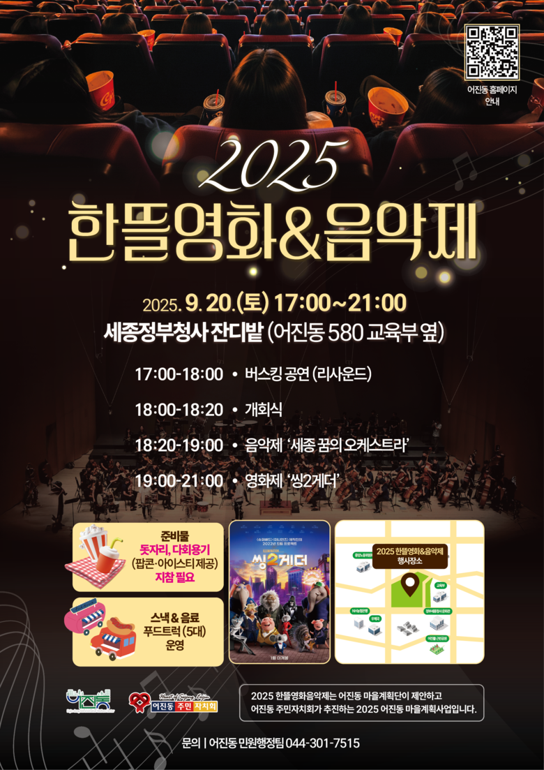 정성헌 어진동주민자치회장은 “한뜰영화&음악제를 주민 모두가 함께 어울리고 소통하는 어진동 대표 문화축제로 꾸준히 발전시켜 나가겠다”며 “가족과 함께 음악을 듣고 영화를 보며 가을밤을 만끽하시길 바란다”고 말했다.