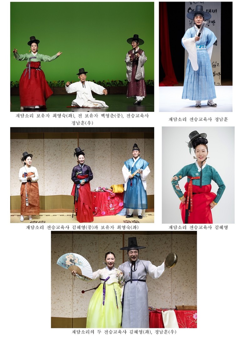 ‘재담소리’의 전승교육사 정남훈, 김혜영은 모두 어려서부터 경기민요를 배웠고, 비슷한 시기에 故백영춘 보유자를 만나 재담소리에 입문한 후 20년간 호흡을 맞춰왔다. 매년 최영숙 보유자와 함께하는 공연을 통해 재담소리의 독특한 매력과 예술성을 보여주고 있다.