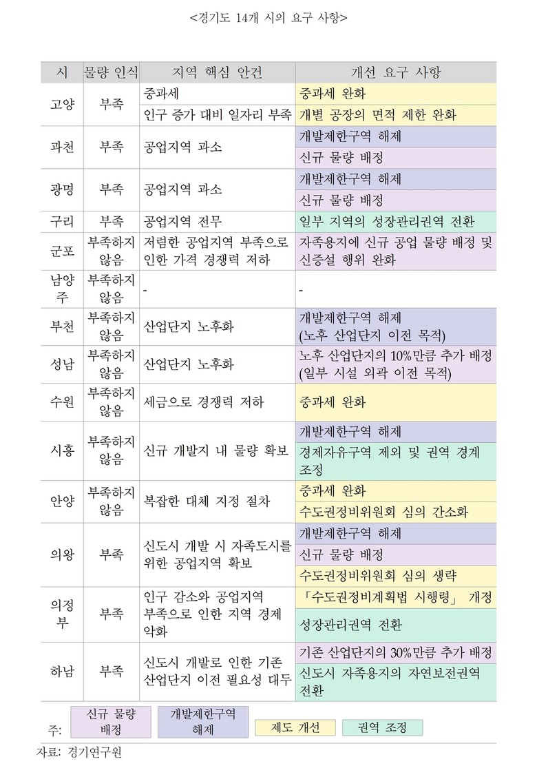 경기연구원이 경기도 과밀억제권역 14개 시를 대상으로 실시한 면담 조사 결과, 7개 시(과천시, 광명시, 의왕시, 하남시, 고양시, 구리시, 의정부시)가 공업지역 물량 부족을 제기했다.