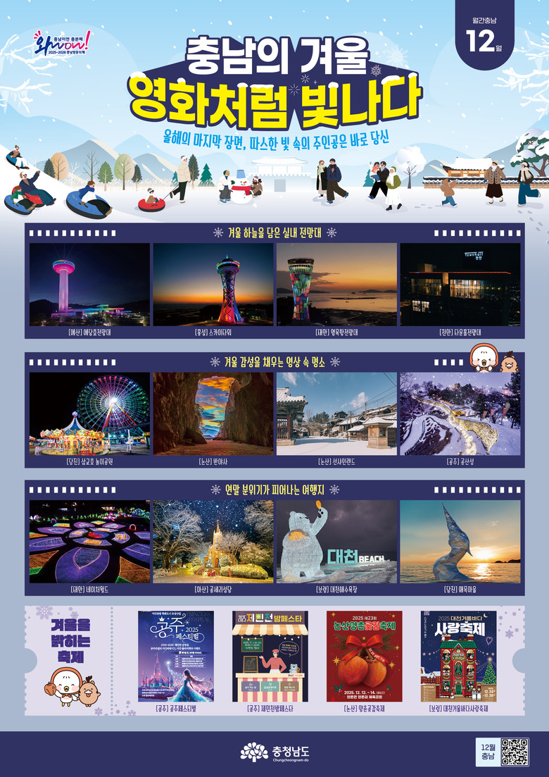 더 많은 겨울 여행 명소와 축제 정보는 충남 관광 누리집(https://tour.chungnam.go.kr/prog/theme/kor/sub01_03_04/list.do) 또는 월간 충남 12월호 정보무늬(QR코드)를 통해 확인할 수 있다.