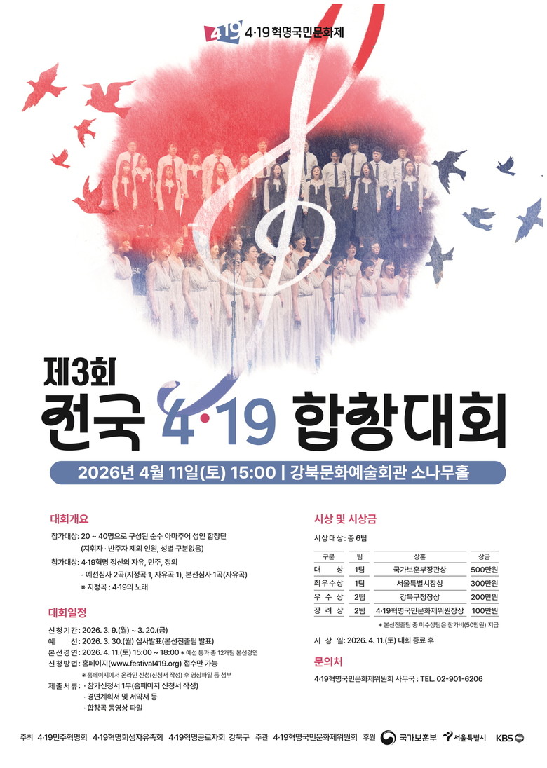 [강북구 세계타임즈=이장성 기자] 서울 강북구(구청장 이순희)가 오는 4월 11일(토) 오후 3시 강북문화예술회관 소나무홀에서 「제3회 전국 4·19 합창대회」를 개최한다.