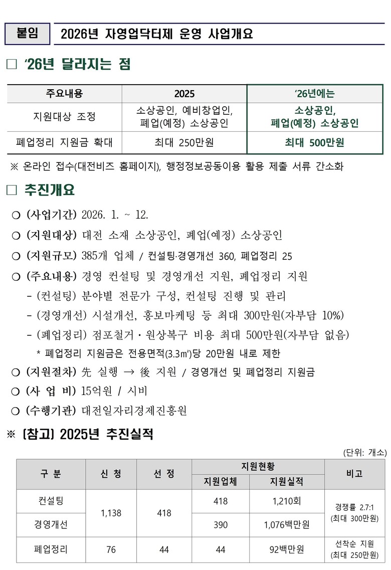 특히 올해부터는 폐업정리 지원금을 250만 원에서 최대 500만 원으로 확대하고 행정정보공동이용을 활용해 신청 서류를 대폭 간소화함으로써 소상공인이 체감할 수 있는 지원 수준을 한층 높였다.