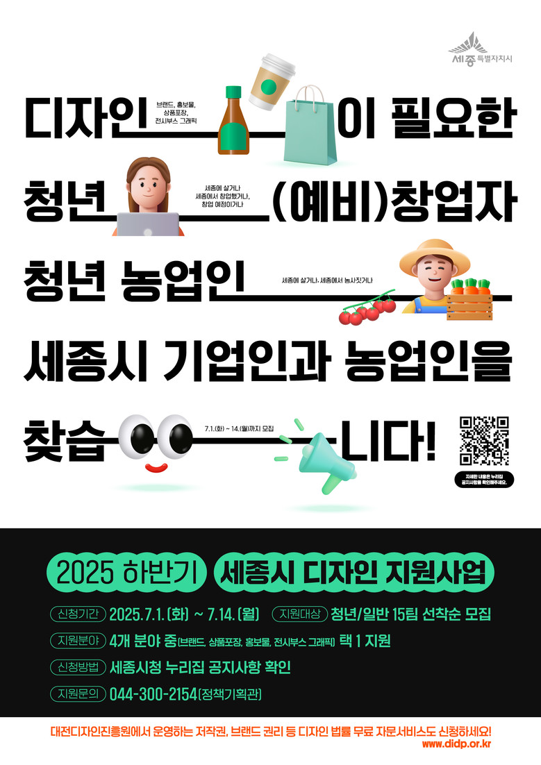 시는 1일부터 14일까지 지역 내 청년과 일반 사업자, 농업인, 예비 창업자 등을 대상으로 ‘2025년 하반기 세종시 디자인 지원사업’의 신청을 받는다.
