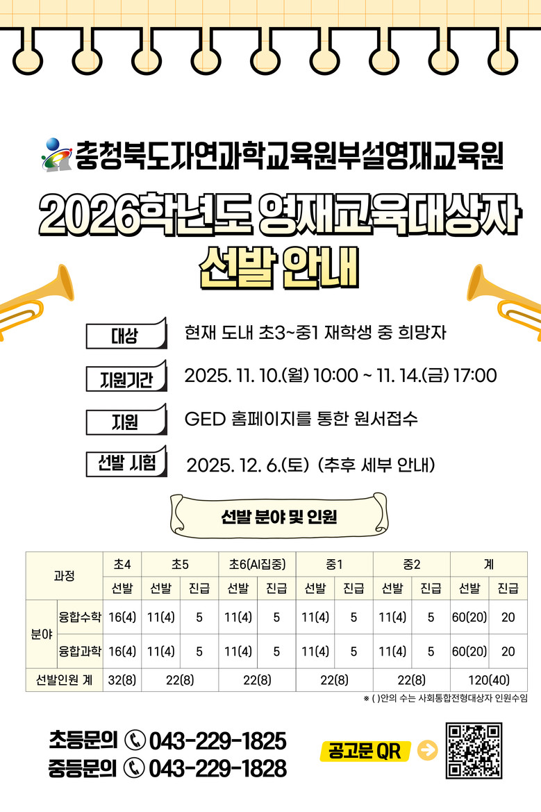 지성훈 자연과학교육원장은 “2026학년도에도 학생들의 영재성을 신장하기 위한 다양한 영재교육 프로그램을 계획하고 있다.”라며, “충북 도내의 영재교육에 관심 있는 학생들이 많이 지원하길 바란다.”라고 말했다.