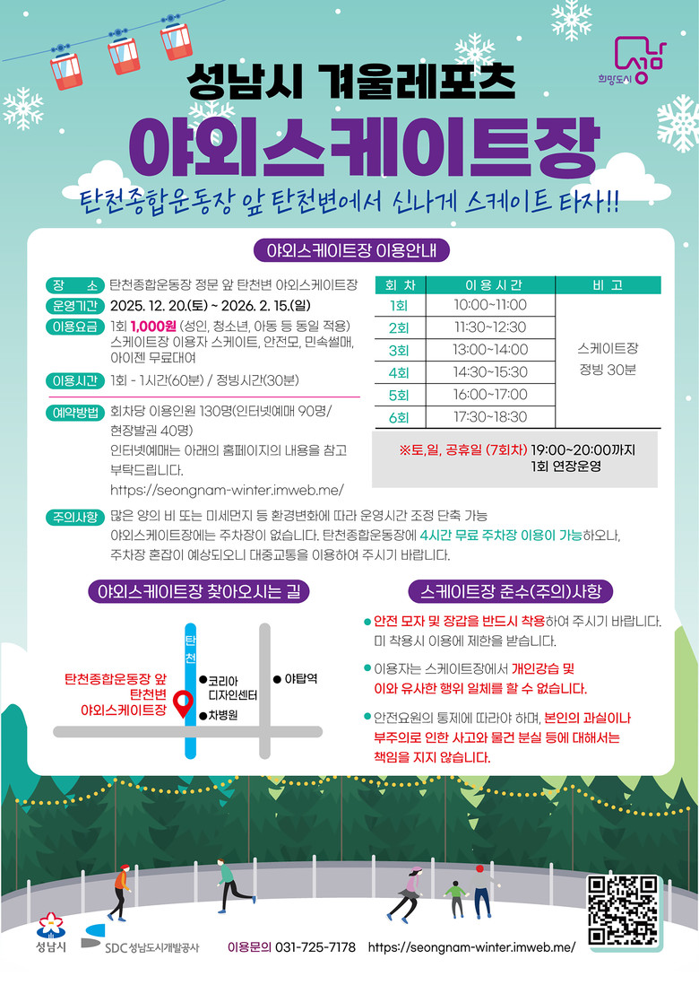 야탑동 탄천변 스케이트장은 4000㎡ 규모로 조성됐다. 일반용 링크(길이 58m×폭 16m)와 민속 썰매 링크(길이 38m×폭 16m)를 갖췄다.