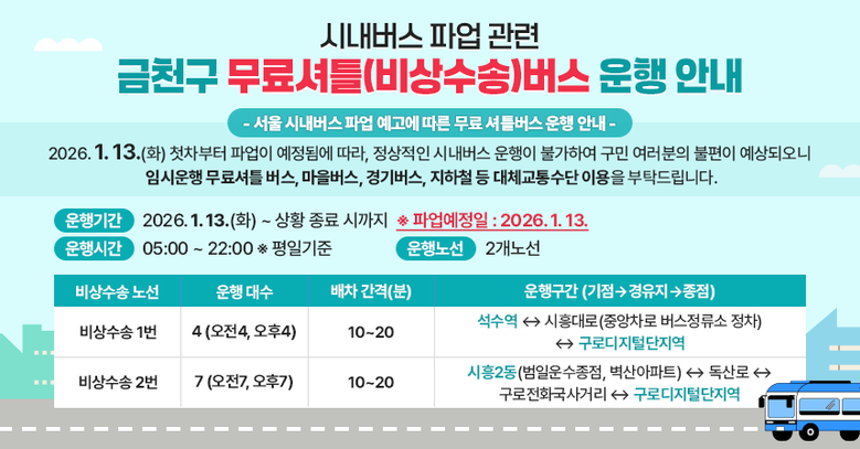 유성훈 금천구청장은 "서울 시내버스 전면 운행 중단으로 인한 주민 불편이 예상돼 무료셔틀버스 운행을 마련했다"며 "가까운 거리는 도보나 자전거를 이용하고, 마을버스·경기버스·지하철 등의 대체교통수단 이용을 부탁드린다"라고 말했다.