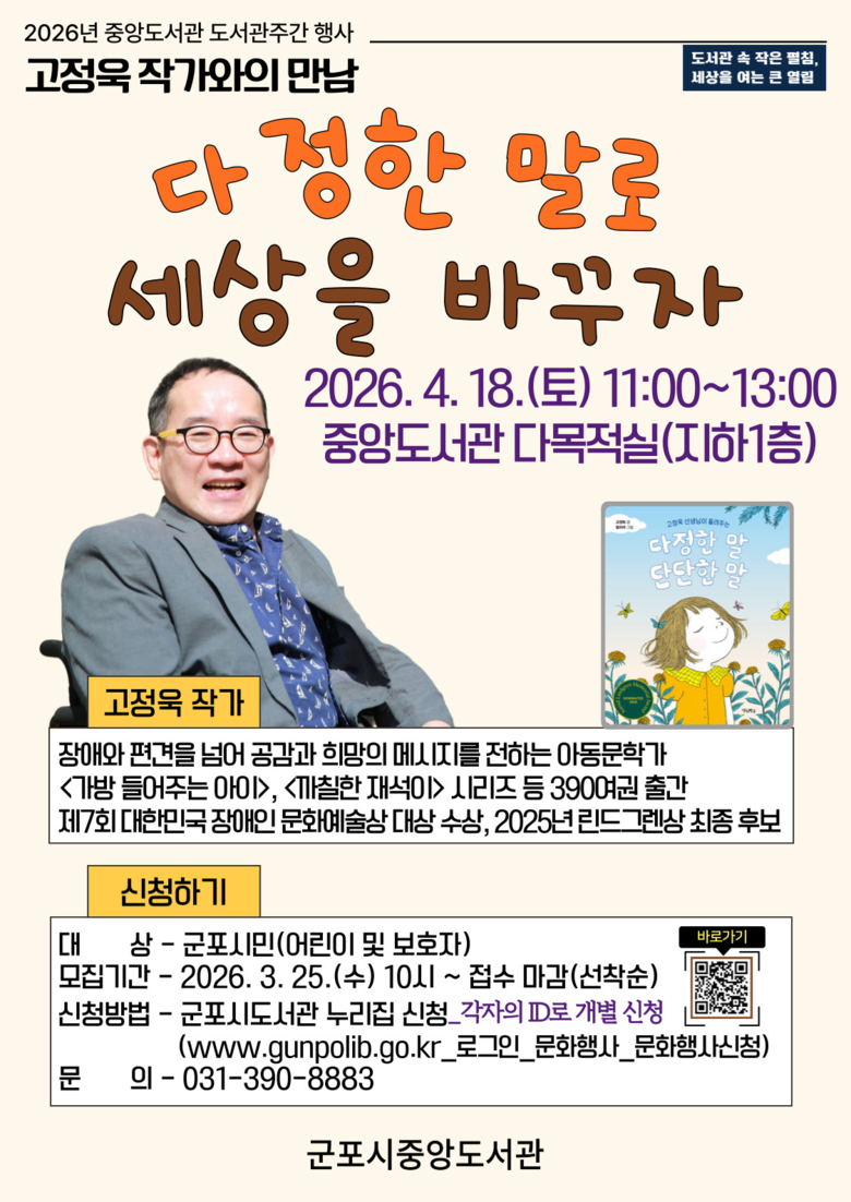 행사 관련 사항은 군포시도서관 누리집(https://www.gunpolib.go.kr/) 공지사항에서 확인할 수 있으며, 참여 신청은 3월 25일(수)부터 선착순으로 접수한다.