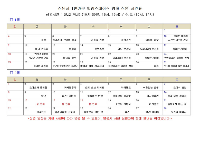상영 당일 성남시 1인 가구 힐링스페이스(☏031-729-1757~9)를 방문해 입실해도 된다.
