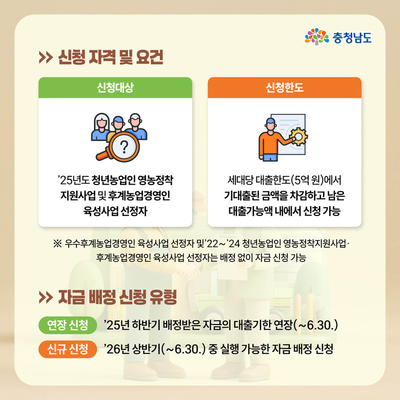 내년 상반기 충남 배정액은 354억 5000만 원으로, 올해 청년농업인영농정착지원사업과 후계농업경영인육성사업 선정자가 신청할 수 있다.