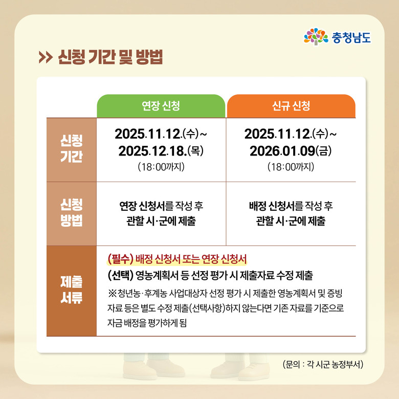 신청 기간은 △연장 다음달 18일 오후 6시까지 △신규 내년 1월 9일 오후 6시까지이며, 신청서 등 제출 서류*는 관할 시군에 제출하면 된다.