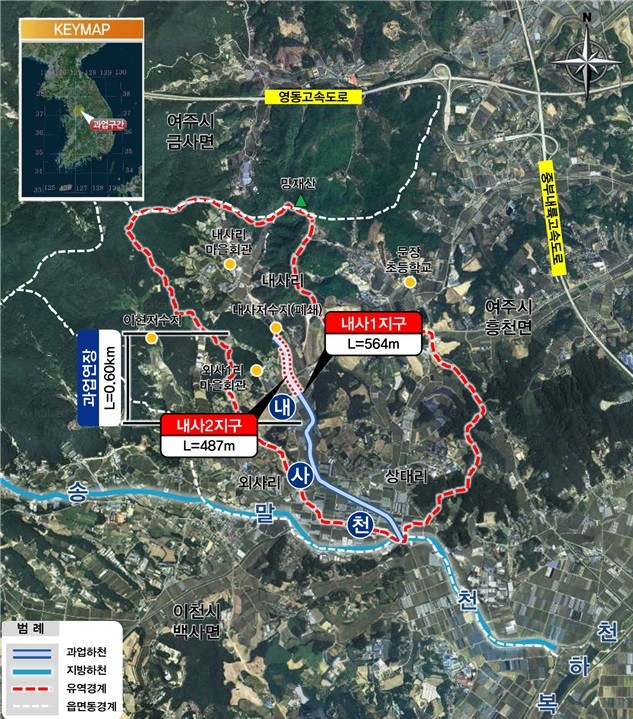 정비사업은 여주시 흥천면 내사리 일원 총 연장 0.6km 구간의 하천을 정비(하폭 6~14 → 15~20m)하는 것으로 ▲축제공(제방 쌓기) 1.05km ▲교량 3개 설치 등이 포함된다.