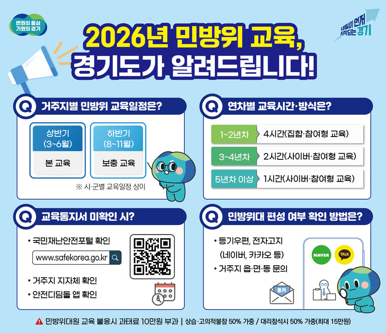 - 92만 민방위대원 교육대상·시간·이수기준 등 경기도 민방위 교육 안내 [경기북부 세계타임즈=송민수 기자] 경기도가 ‘2026년도 민방위 교육’과 관련해 도민들의 편의를 위해 시군별 문의가 많은 사항을 중심으로 교육대상·교육시간·교육방법을 안내했다.