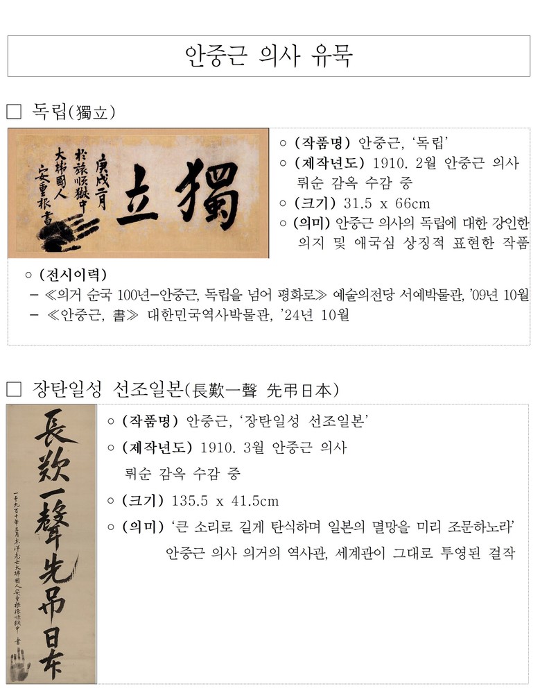 안중근 의사의 유묵은 단순한 서예 작품을 넘어 역사적 가치가 있는 문화유산이다. 김동연 경기도지사는 광복 80주년 경축사에서 유묵의 귀환을 위해 적극적으로 노력하겠다고 밝힌 바 있다. 광복회 경기도지부와 경기도가 함께 귀환을 추진하고 있는 첫 번째 유묵은 ‘독립(獨立)’이다. 1910년 2월 뤼순 감옥에서 남긴 안중근 의사 하면 누구나 떠올리는 대표 작품으로 강인한 독립 의지와 애국심이 응축돼 있다. 두 번째 유묵은 1910년 3월에 집필한 ‘장탄일성 선조일본(長嘆一聲 先弔日本)’이다. ‘큰 소리로 길게 탄식하며 일본의 멸망을 미리 조문한다’는 뜻을 담고 있는 작품은 안중근 의사의 역사관과 세계관이 투영된 작품이다.