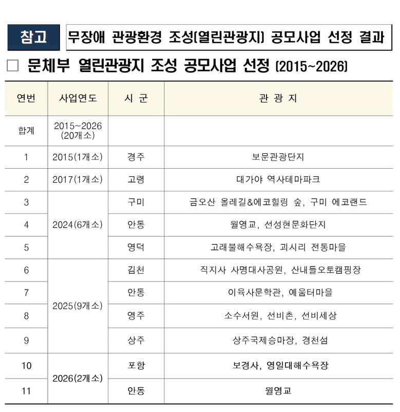 올해 공모에서는 전국적으로 30개 소를 선정하는 열린 관광지 사업과 무장애 관광 연계성 강화 사업이 함께 추진되었으며 경북도는 총 3개소 관광지를 확보했다.