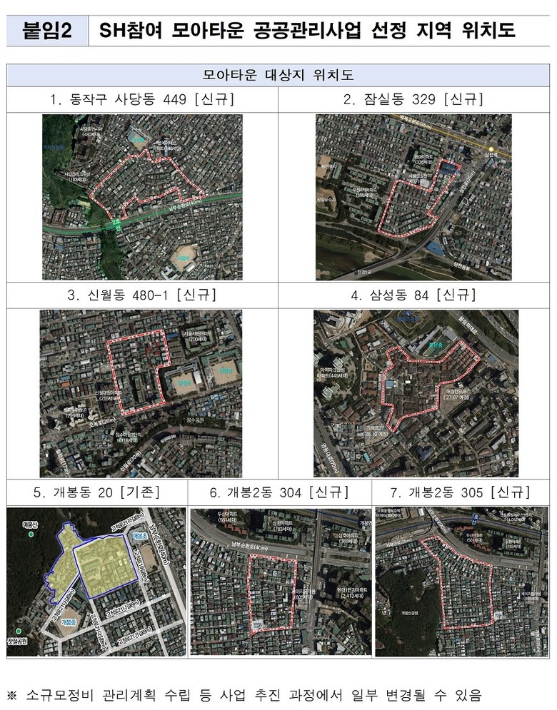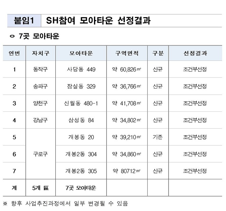25일(수) ‘SH 참여 모아타운 선정위원회’를 열어 ▴구로구 개봉동 ▴송파구 잠실동 등 총 7곳을 모아타운 최종 대상지로 선정하였다.