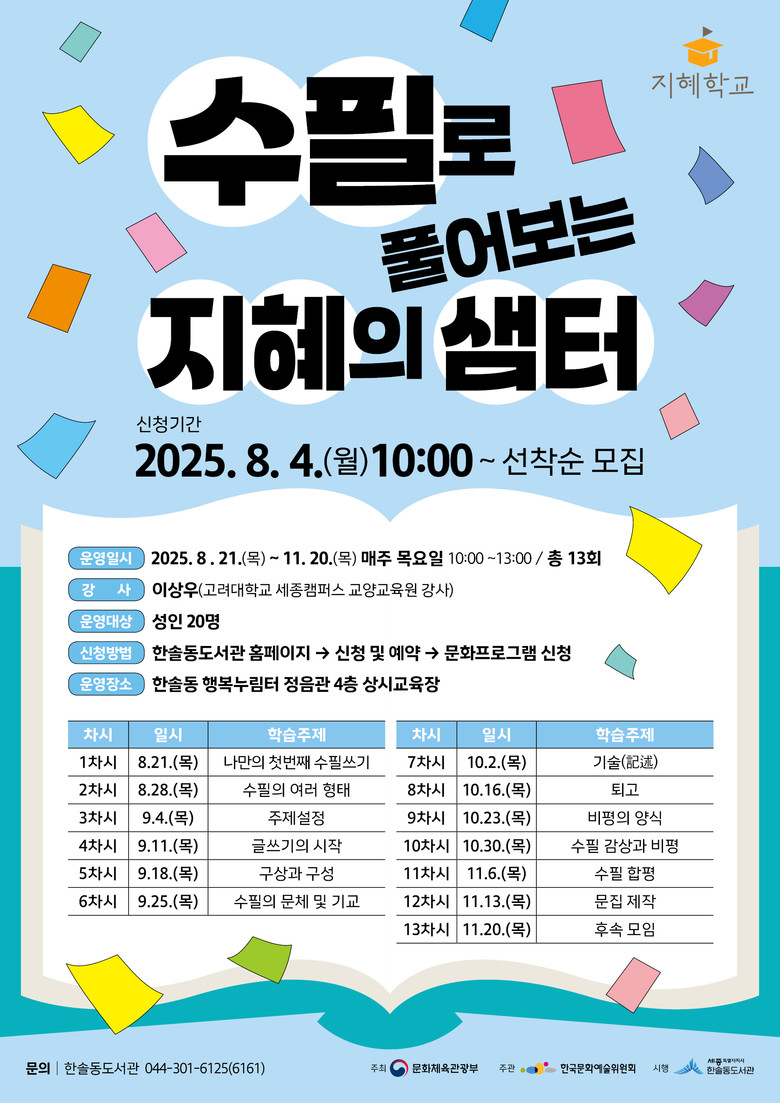 이번 강좌는 한솔동도서관이 문화체육관광부와 한국문화예술위원회가 지원하는 ‘2025 지혜학교’ 사업의 운영기관으로 선정되며 마련된 것이다.