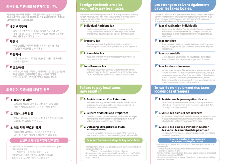 외국인 지방세 안내 리플렛은 한국어, 영어, 중국어, 프랑스어 등 4개 언어로 구성돼 ▲주민세·자동차세·재산세·지방소득세 등 주요 지방세 항목에 대한 설명 ▲납부 방법 ▲체납 시 발생할 수 있는 불이익(비자연장 제한, 재산 및 채권 압류, 체납 차량 번호판 영치 등을 외국인도 이해하기 쉽도록 상세하게 안내하고 있다.
