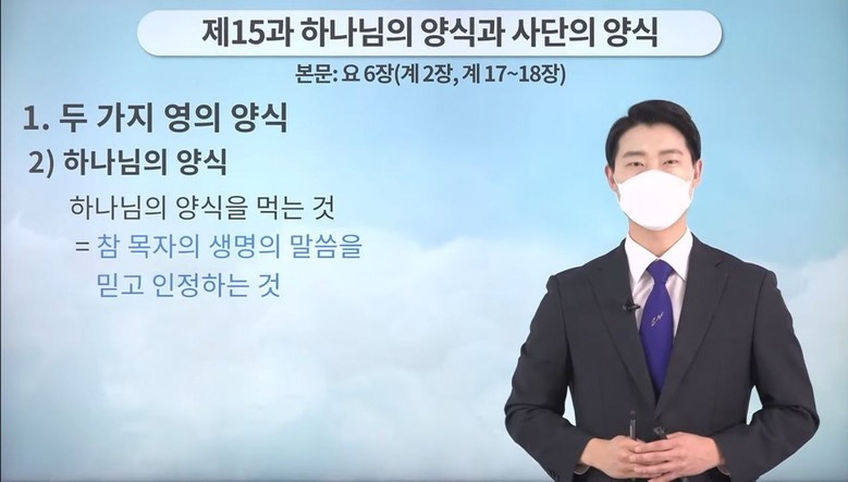 요한복음 6장의 예수님은 "나는 하늘에서 내려온 산 떡"이라고 말했다. 예수님의 육체를 먹을 수는 없는 것이니, 육의 양식이 아닌 귀로 들어먹는 영의 양식이 되겠다.