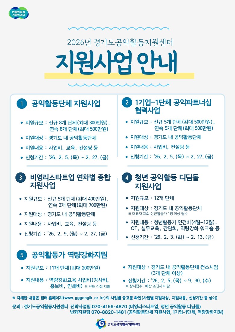 모든 사업은 경기도 내 공익활동단체 및 관련 주체를 대상으로 하며, 사업별 세부 모집 요강과 신청 방법은 경기도공익활동지원센터 누리집(www.gggongik.or.kr)에서 확인할 수 있다.