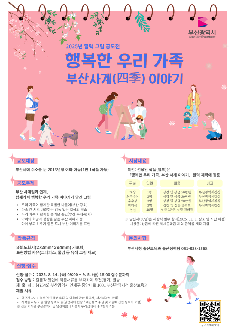 ◈ 총 50명을 선정하며, 수상작 일부는 2026년 달력에 실릴 예정… 공고 시작일(8.13.)기준 부산시에 주소를 둔 2013년생 이하 아동이면 누구나 참여할 수 있어 [부산 세계타임즈=이용우 기자] 부산시(시장 박형준)는 오는 9월 5일까지 「행복한 우리 가족, 부산 사계(四季)이야기」 달력 그림 공모전을 개최한다고 밝혔다.